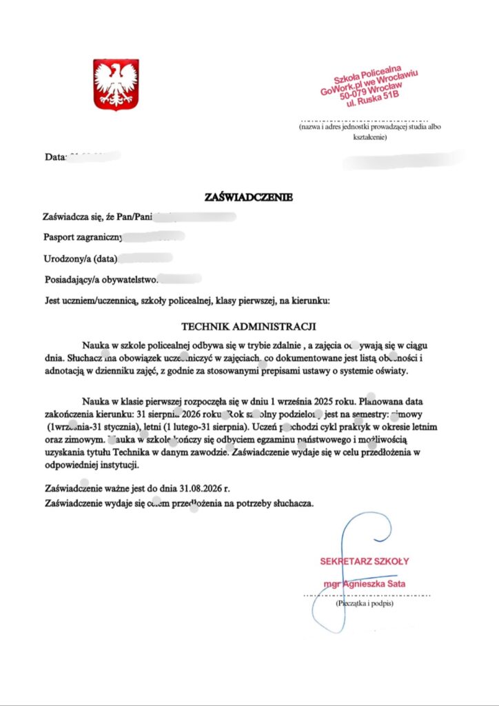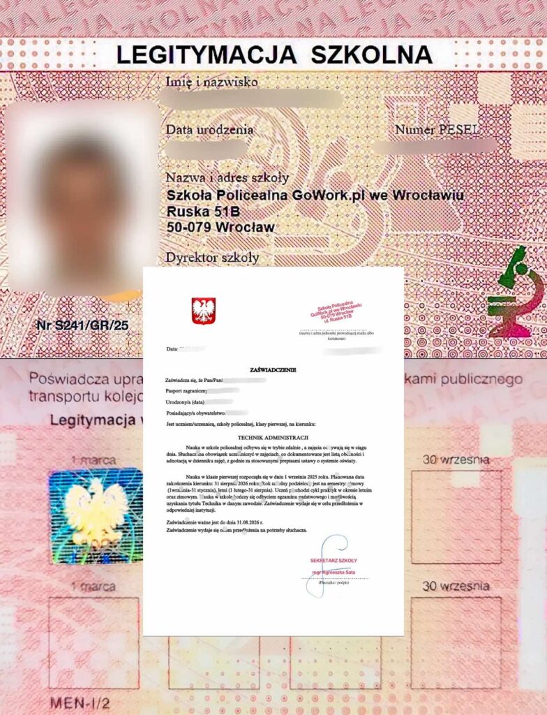 — это комплект документов от полицеальной школы, которая дает вам возможность получить ставку студента и все возможные льготы в Польше. Срок действия справки 6 месяцев.