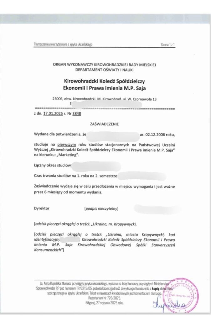— это справка от украинского вуза с присяжным переводом на польский язык. Эта справка позволит получать вам повышенную ставку студента.
